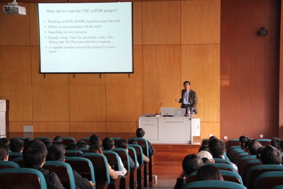 11月23日上午管教授在医学院科研辅楼大报告厅举行了题为 The mTOR and Hippo Pathways: How Key Discoveries We Made? 的学术讲座,全校数百名师生的积极参与,全场热情高涨,座无虚席。管教授介绍了其实验室在mTOR领域的工作,详细分析了生长因子和细胞内的氨基酸水平以及能量水平多因素对mTOR激酶的调控机制;然后介绍了最近几年所做的关于Hippo信号通路的相关工作,阐释了Hippo通路在控制器官大小中的作用,并介绍了Hippo信号通路的最新进展。