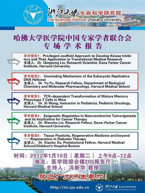 应leyu乐鱼(中国)官方网站-登录入口冯新华院长的热情邀请,10位哈佛医学院系统的青年科学家组成代表团将于2012年1月10日上午对leyu乐鱼(中国)官方网站-登录入口进行学术访问,其中LIU Qingsong(刘青松)、FU Yu(付钰)、WANG Xi(王玺)、LIN Wenchu(林文楚)、XU Xiaobo(许小波)等五位将做精彩的学术报告。会议采用学术报告与讨论相结合的形式,对相关领域的前沿科学问题与发展趋势进行积极的探讨与交流,欢迎全校师生踊跃参加!
