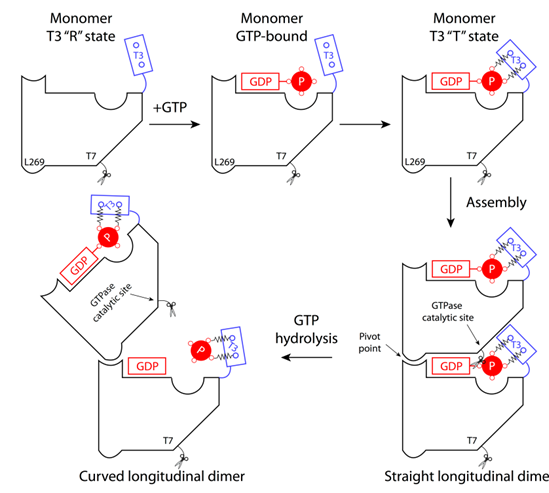 | 图1: GTP水解导致的FtsZ原丝纤维从垂直到弯曲的构象变化模型。 |