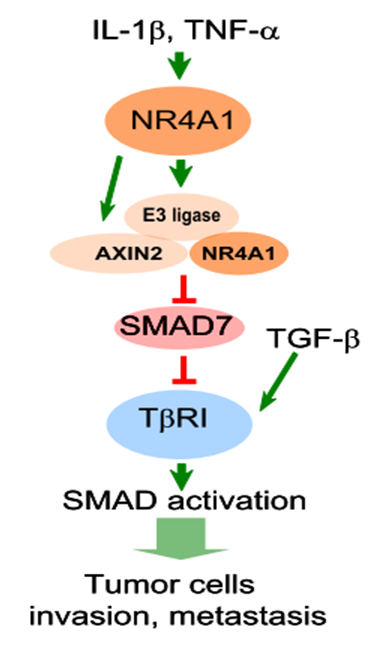 浙大生命科学研究院张龙课题组最近发现一个核受体NR4A1,它可以激活TGF-β信号通路,并且在乳腺癌细胞中,NR4A1可以被炎症因子诱导表达。这一研究成果提出肿瘤微环境如何影响肿瘤细胞转移的新的理论,即肿瘤微环境可以利用肿瘤周围的免疫炎症因子激活肿瘤细胞内部核受体的表达,从而激活促进肿瘤细胞转移的 TGF-β 信号通路,由此来促进肿瘤细胞的转移,揭示了肿瘤形成后期尤其是癌细胞转移过程中 TGF-β 信号通路受核受体调控进而影响肿瘤转移的分子机制,并为抗癌新药的研发提供了理论基础。