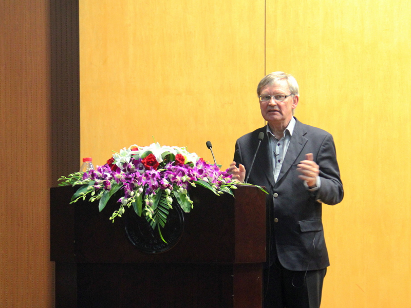 13日下午的学术讲座师生积极踊跃,可容纳300余位的报告厅座无虚席,还有不少听众倚墙而站或席地而坐。Carl-Henrik Heldin教授做了题为“TGF-β Signaling via Smad and non-Smad Pathways”的学术报告,主要介绍了TGF-β信号通路在癌症早期发生和癌症晚期转移中的功能和作用,分别报告了经典的Smad转录调控促进上皮细胞间充质化和非Smad介导的TGF-β受体I的被切割入核调控癌症转移的调控机制,并介绍了相关领域的重大科学问题和最新进展。提问环节,师生们围绕TGF-β与Carl-Henrik Heldin教授进行了热烈讨论和深入交流。
