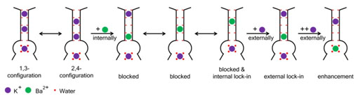 钡离子和钾离子大小类似(钡的离子半径为1.35 Å,钾为1.33 Å),然而却携带双倍的电荷。钡离子的大小使得它很容易进入钾离子通道的离子选择筛,然而它所携带的电荷使它在离子选择筛中的结合过于紧密,因而导致钡离子对钾离子通道的阻断效应。离子通道研究领域的先驱,布兰迪斯大学(Brandeis University)的 Christopher Miller博士在上世纪八十年代通过对钾通道的钡阻断进行电生理学研究发现钾离子对于钡离子从钾通道逃逸存在三个效应:外部锁定效应(external lock-in effect)、增强效应(enhancement effect)和内部锁定效应(internal lock-in effect),他还前瞻性地推理出钾离子通道的结构,并在十几年后被钾离子通道的晶体结构所验证。然而钡离子和钾离子在钾离子通道中是如何相互作用而导致这些效应,至今仍然是离子通道研究领域争议的热点。