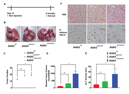 在该项研究中,仓勇课题组利用转基因技术将对应人ALDH2*2的变异引进小鼠的ALDH2基因,从而构建ALDH2(E487K) kockin小鼠品系。该小鼠品系与ALDH2*2人群非常相似,缺乏有效代谢酒精的功能。利用该小鼠模型,作者发现,ALDH2(E487K)的小鼠肝细胞中ALDH2蛋白酶活性降低,而乙醇的肝毒性增加,并且加速了化学诱导性肝癌的生长。更加重要的是,该研究还发现在有ALDH2*2变异的人类肝脏样本中,ALDH2蛋白更加不稳定,而在人类肝癌标本中其表达水平和周边非癌组织相比进一步明显下调。作者通过小鼠模型和临床数据,揭示了ALDH2是一种肝癌的肿瘤抑制因子,而ALDH2*2多态性是肝癌的风险因素之一。由于饮酒脸红导致的对饮酒的间接排斥,简单地研究ALDH2*2和肝癌人群并没有得出有统计意义的相关性,但是借用动物模型我们肯定了该基因的多态性会提高肝癌的风险。该发现有助于人们深入理解ALDH2*2多态性通过间接影响ALDH2蛋白稳定性在调控肝脏疾病及肿瘤发生中的作用。