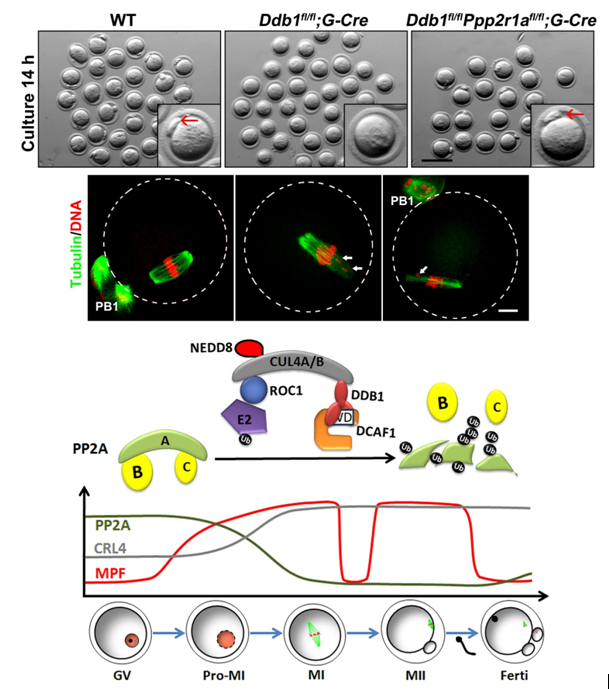 继2013年范衡宇课题组在Science杂志发表研究论文、首次阐明了CRL4在防止卵巢早衰和延缓更年期中的作用以后,在本研究中进一步利用基因敲除小鼠为模型,研究了该蛋白复合体在卵母细胞成熟中的作用,实时观察了CRL4敲除以后卵母细胞减数分裂的进程,发现CRL4对于卵母细胞减数分裂细胞周期的顺利进行和同源染色体的正确分离至关重要。CRL4通过其底物识别蛋白DCAF1结合卵母细胞中的重要蛋白磷酸酶PP2A,使其泛素化并被降解,推动减数分裂的细胞周期进程,促进同源染色体分离和卵子的极体排放。