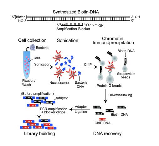染色体免疫共沉淀与下一代测序结合(ChIP-seq)可以分析细胞或组织的全基因组表观遗传谱,但ChIP-seq这个技术需要大量的细胞来获得高质量的数据,与RNA-seq, Genome DNA-seq技术相比获得核酸的步骤更加复杂,需要进行免疫沉淀实验获得核酸,这局限了ChIP-seq应用于稀有细胞的研究。目前已有的低细胞量的ChIP-seq方法只是在获得核酸后进行扩增以满足第二代测序文库构建的需求,这无法避免ChIP实验中大量核小体信息的丢失,同时引起数据真实度下降,不利于后续的分析。