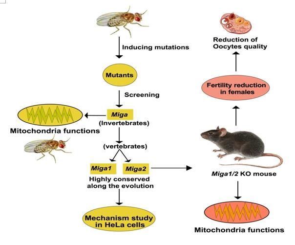 最近,佟超课题组在果蝇中进行人工诱变和遗传筛选,找到了一个新的对于维持线粒体动态和功能非常重要的基因,并将其命名为线粒体保护素(Mitoguardin),简称Miga。在脊椎动物中Miga进化成两个同源基因Miga1和Miga2。Miga在果蝇中的突变株有视神经退行性缺陷并导致个体胚胎致死。