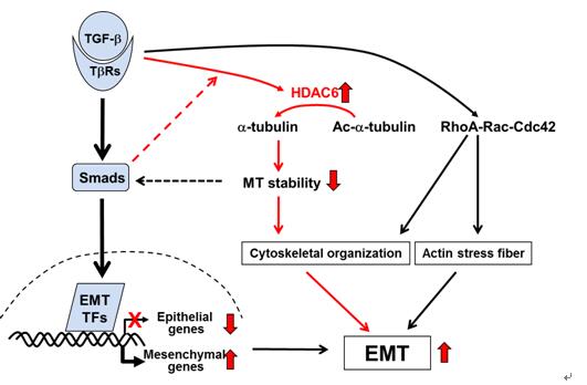上皮细胞-间充质转化(EMT)表现为上皮细胞失去自身的特点,并获得间充质细胞的特性,包括上皮细胞极性的丢失、细胞骨架的重排以及迁移能力和侵袭能力的获得。TGF-beta被认为是诱导EMT最重要的因子,但具体精确机制尚不十分清楚。微管蛋白tubulin作为细胞骨架的重要组成部分,参与了细胞分裂的过程,也在细胞各个时期对细胞结构都起着重要作用。它的乙酰化对于微管蛋白结构稳定、细胞形态以及迁移起着重要作用,但其是否参与了EMT的诱导和维持仍然知之甚少。