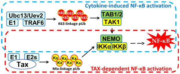 Tax激活IKK-NF-κB通路机制模式图。在炎症因子(如IL-1β)刺激细胞时,E3 TRAF6E2 Ubc13/Uev2会合成K63连接的多聚泛素链,以此来激活TAK1激酶复合体,TAK1磷酸化激活下游的IKK激酶复合体,并最终使NF-κB通路激活。而当HTLV-1感染时,病毒编码的蛋白Tax作为一个E3,能够利用宿主细胞内的泛素化系统合成混合型连接的多聚泛素链,这种泛素链可以直接激活IKK激酶复合体,从而使NF-κB通路激活,造成慢性炎症,并最终引起包括成年人T细胞白血病(ATL)在内的诸多疾病。