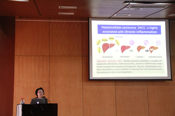 通常从临床表现上肝癌发生前期会伴随炎症反应。目前,炎症反应与肝癌之间的相关性是很多人感兴趣的部分,也是现在亟待解决的问题。王院士在报告中为大家阐释了肝癌与炎症之间的作用。首先王院士介绍了肝癌发生前期的炎症反应时HGDN中,低剂量的type1 IFN诱导miR-484导致肝癌的发生。并阐述了lnc-DILC通过抑制IL6/STAT3进一步抑制肝癌干细胞的形成。最后介绍了肝脏中Kupffer cell中的EGFR的表达与肝癌发生之间的关系。这些科研成果都可以在肝癌尚未产生的初期作为药用靶标,或者作为肝癌预后检测的指标。提问环节,师生们积极踊跃,就“肝癌研究与精准医疗”与王院士进行了激烈讨论和充分交流。