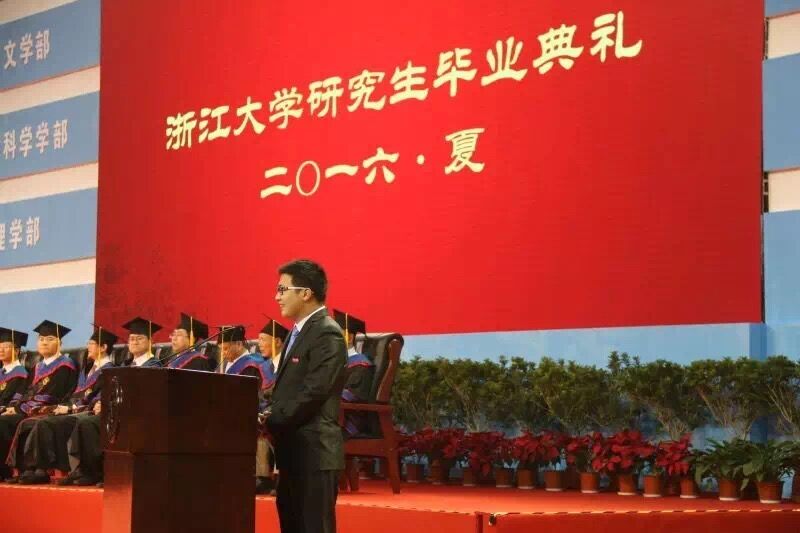 结束了上午的合影留念,下午毕业生们参加了学校举行的2016届夏季研究生毕业典礼暨学位授予仪式。鉴于博士期间突出的科研成绩,我院2011级博士研究生余超作为此届毕业研究生代表在典礼上发言。余超在发言中表达了对母校的感谢,同时对浙大的将来献上祝福。