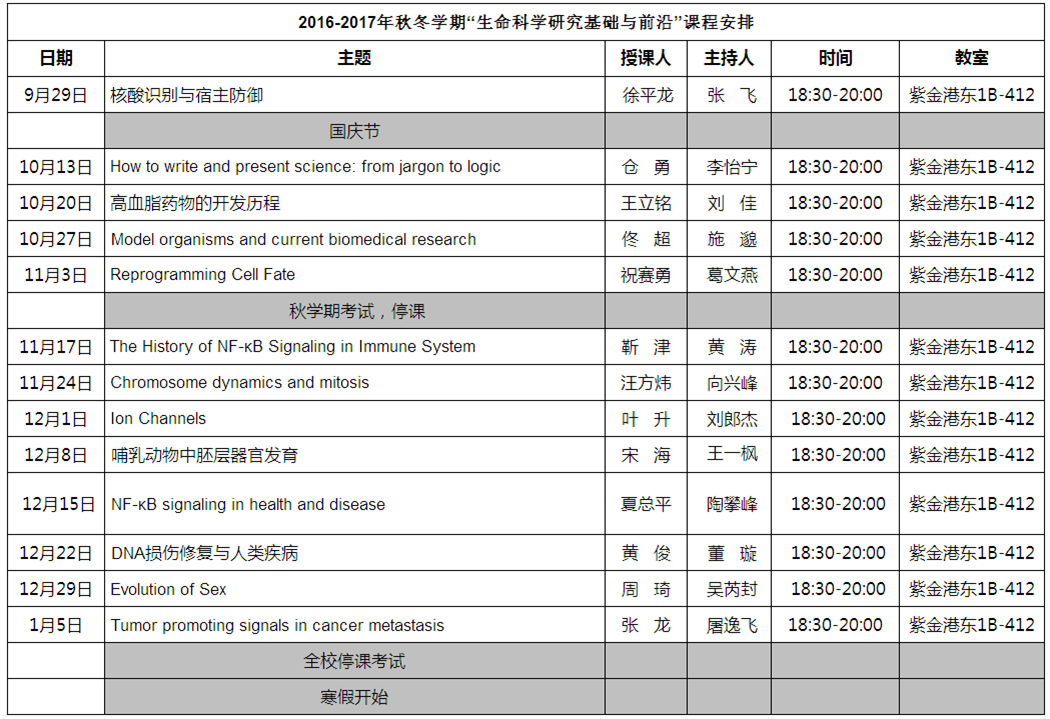 “生命科学研究的基础和前沿”(秋冬学期,紫金港开设)是leyu乐鱼(中国)官方网站-登录入口召集生研院教授和国内外生命科学领域知名科学家共同讲授、并通过三年实践经验精心制作的一门生命科学通识课程。课程英文名称为“Basics in Becoming a Biologist”Series 课程(简称“B3课程”)。