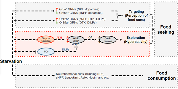 这项研究揭示了饥饿条件下果蝇觅食行为的神经生物学机制,并在激素水平区分了觅食和进食行为。该研究阐述了“饱信号”(胰岛素)和“饿信号”(胰高血糖素)同时调节AKHR神经元的信号发放,使其释放章鱼胺来调控觅食行为。该工作为哺乳动物觅食行为调控机制的最终揭示提供了扎实的理论基础。
