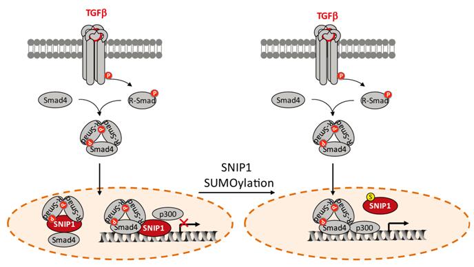 Smad核内结合蛋白(Smad nuclear interacting protein1,SNIP1)是一个主要定位在细胞核内的蛋白。SNIP1与TGF-beta信号转导因子Smad4发生相互作用,能够抑制Smad4对共激活子CBP/p300的招募,从而抑制TGF-beta下游基因的激活。SNIP1的高表达与癌症的预后不良具有很强的相关性。尽管SNIP1在多种细胞进程中都起着十分重要的作用,但是SNIP1本身的活性是如何被调控的,目前尚不清楚。冯新华实验室发现了SNIP1被SUMO化修饰,确定了SNIP1的SUMO化修饰的生物学功能。该发现有两个亮点: