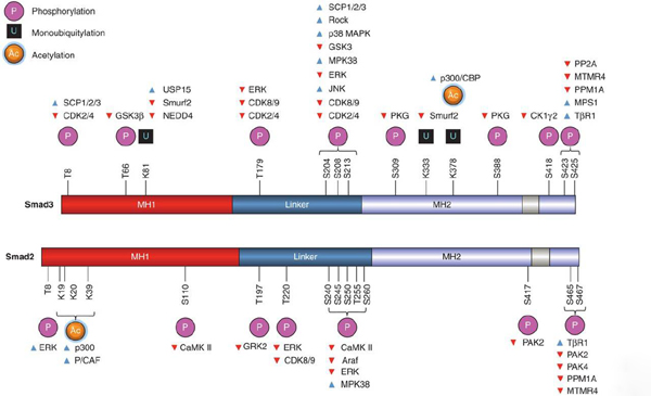 图:当前已鉴定的Smad2/3蛋白翻译后修饰、相应的修饰酶以及对TGF-beta信号的调控作用