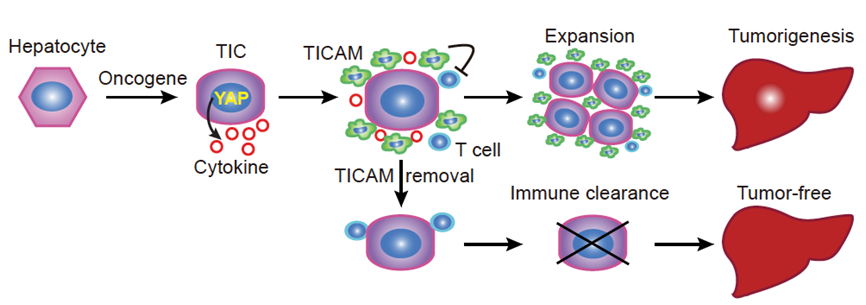 Hippo通路是近年发现的一条调控器官大小发育的细胞信号转导通路。在小鼠肝脏内,Hippo信号通路关键激酶Mst1/2的敲除或被其抑制的转录辅激活因子YAP的转基因表达导致肝脏的迅速增大,继而发生肝脏肿瘤。在人的肝癌样品中也发现YAP被大量激活。然而YAP的激活如何促进肿瘤起始尚不清楚。赵斌课题组的这项研究首先发现在肝细胞中激活YAP能够强烈的募集巨噬细胞到肿瘤起始细胞周围。趋化因子芯片分析和其它实验表明YAP的激活诱导CCL2和CSF1两个趋化因子的表达。而在激活YAP的同时敲减这两个因子则能够阻止巨噬细胞的招募。因此肿瘤起始细胞中YAP对CCL2和CSF1的诱导表达是招募巨噬细胞的原因。有意思的是敲减CCL2和CSF1还阻止了YAP诱导的肝肿瘤形成。进一步研究表明招募的巨噬细胞为2型巨噬细胞,他们通过对T细胞的抑制使得肿瘤起始细胞能够逃逸免疫监视,避免被清除。进一步研究表明在小鼠肝脏内一些人的肝癌致病基因也能够通过激活YAP导致巨噬细胞的招募,并且在人的肝癌前病变样品中也存在YAP激活与巨噬细胞招募的相关性。这一研究的亮点在于首次通过对肝脏肿瘤起始细胞的遗传操作证明了巨噬细胞的特异性招募在单个肿瘤起始细胞阶段对肝脏肿瘤发生的关键作用,并证明了Hippo通路是这一功能的关键分子机制。这一研究提示我们特异性抑制YAP或YAP激活招募的巨噬细胞可能是清除肝脏肿瘤起始细胞,预防和治疗肝癌的有效手段。另一方面,这一课题的研究依赖于液态动力学注射PB 转座子介导的基因编辑系统这一新的小鼠肝细胞基因修饰体系。该体系灵活有效、可操作性强,可以广泛用于在体内研究肝癌发生和肝细胞内信号转导的机制。