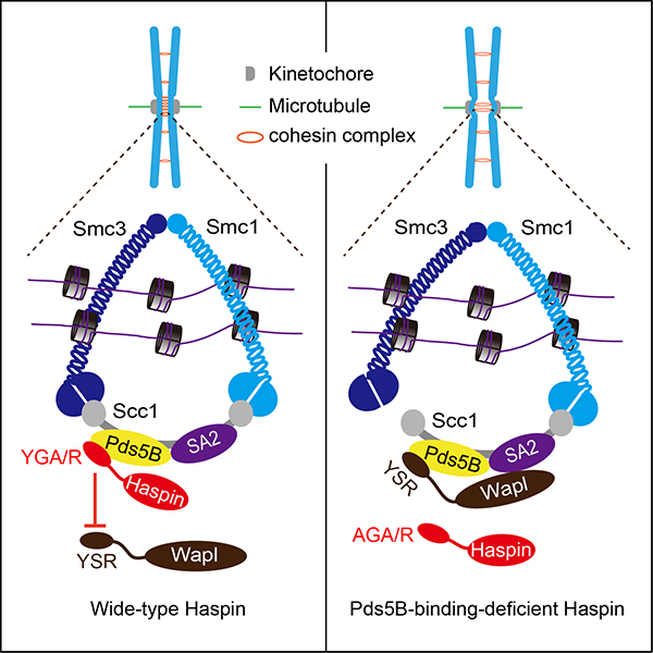 汪方炜实验室研究发现,蛋白激酶Haspin通过位于氨基端非激酶域的一个保守基序(motif)与cohesin的调节亚基Pds5B直接结合;而且,Haspin与Pds5B的结合能竞争性地阻碍Wapl以类似的方式与Pds5B相结合。敲除Haspin或特异性地破坏Haspin与Pds5B的结合,会造成着姐妹染色体粘连的缺陷,使得染色体不能正常整列并提前分离;而抑制Wapl的活性或恢复着丝粒区Haspin与Pds5B的结合,则可以防止姐妹染色体粘连缺陷的发生。这些结果表明,Haspin通过结合Pds5B拮抗了Wapl对着丝粒区cohesin的去除,保证了姐妹染色单体的正常粘连和正确分离,从而保护了染色体的稳定性。
