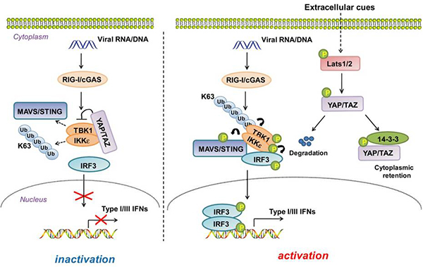 图:细胞营养/接触胁迫经Hippo-YAP通路调控细胞质核酸识别和抗病毒宿主防御的功能与分子机制。