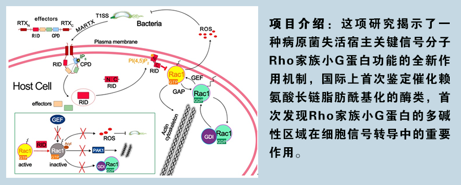 以第一单位及唯一通讯作者在Science杂志上发表论文,这项研究揭示了一种失活宿主关键信号分子Rho家族小G蛋白的全新调节方式,首次发现催化赖氨酸长链脂肪酰基化的酶类,首次证明Rho家族小G蛋白的多碱性区域在细胞信号转导中发挥重要作用。目前尚无治疗创伤弧菌感染的有效抗菌药物,由于RID是创伤弧菌导致小鼠感染致死的必需毒性因子,该研究对研发针对创伤弧菌的抗菌药具有重要应用价值。
