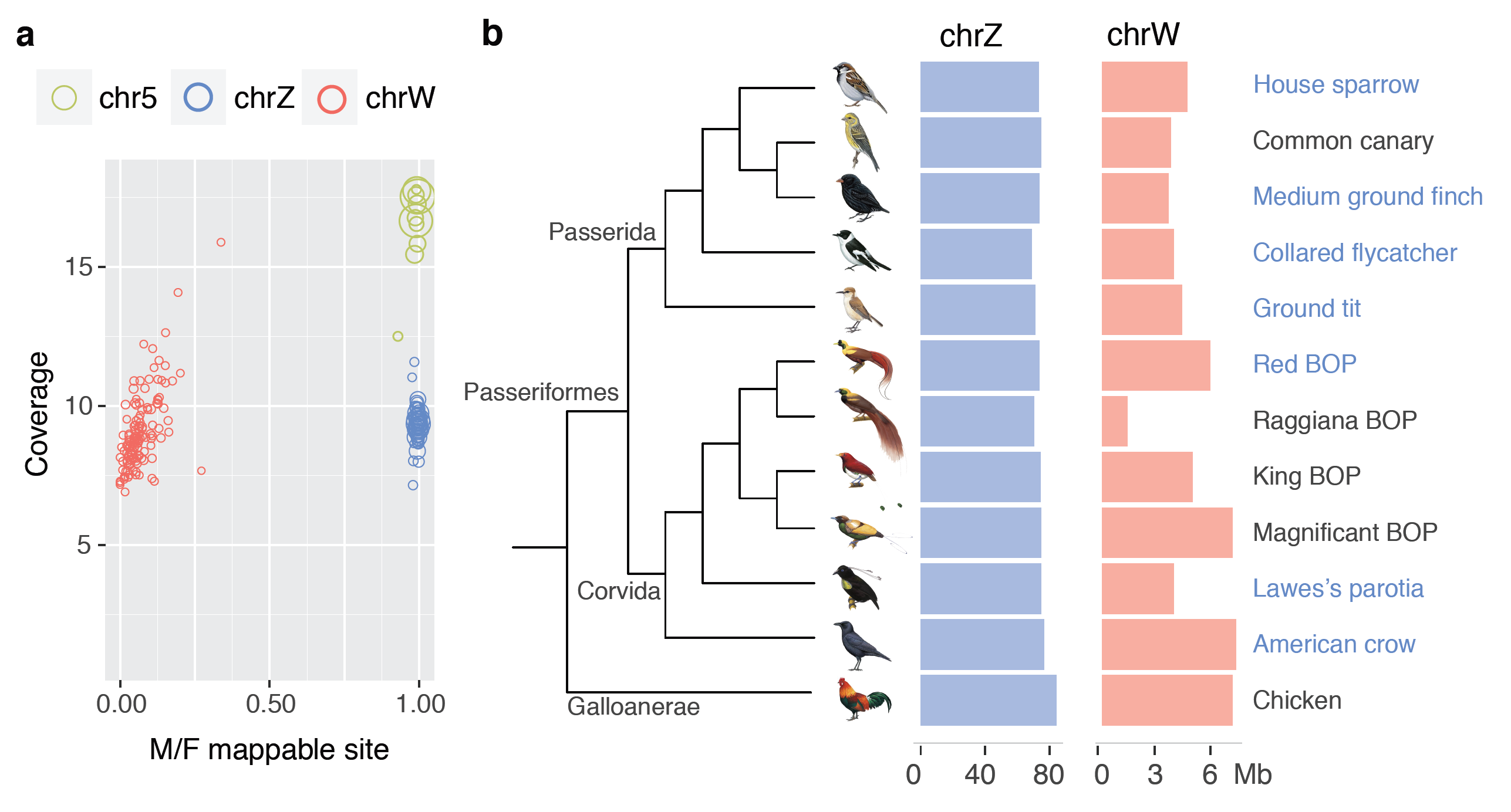 该研究产生了五个天堂鸟物种的高质量雌性基因组,并分析了其他已经公布的总共11种鸣禽的基因组来重构它们的性染色体演化。鸣禽(songbird)是鸟类物种最大的分支,包括了人们熟悉的斑马雀,麻雀,乌鸦,金丝雀,还有天堂鸟等等,物种数目接近所有哺乳动物物种数目的总和,占所有鸟类物种数目的一半。和其他鸟类一样,鸣禽的性染色体和哺乳动物的XY类型相反,为ZW类型(即雄性为ZZ,雌性为ZW)。研究发现尽管鸣禽物种多样性丰富,但它们的性染色体有共同的演化历史,都经历了四次同源重组抑制。这些重组抑制使得性染色体的不同区段形成截然不同的序列差异,被称为“进化断层”(evolutionary strata)。这样的重组抑制保证了雌性特异的W染色体上雌性相关或者雌性性别决定的基因,无法通过重组到Z染色体进入雄性,维持了性别的稳定。有意思的是,传统理论认为,重组抑制是由染色体之间的倒位引起,而本研究发现很有可能是重复序列的特异扩张,导致了重组抑制。证据主要来源于在两段相邻的重组抑制区域的边界,研究者发现了大量的鸣禽特异的转座子爆发事件。而在W染色体上,不同的鸣禽物种之间,尽管它们大都经历了强烈的性别选择,W染色体仍然保留了一定数目的功能基因(通常来说Y或者W染色体会由于无法重组而丢失大量基因)。这些基因大都在其他物种中比其他基因有更广泛的组织表达模式,很可能是由于它们的持家基因功能而被保留。