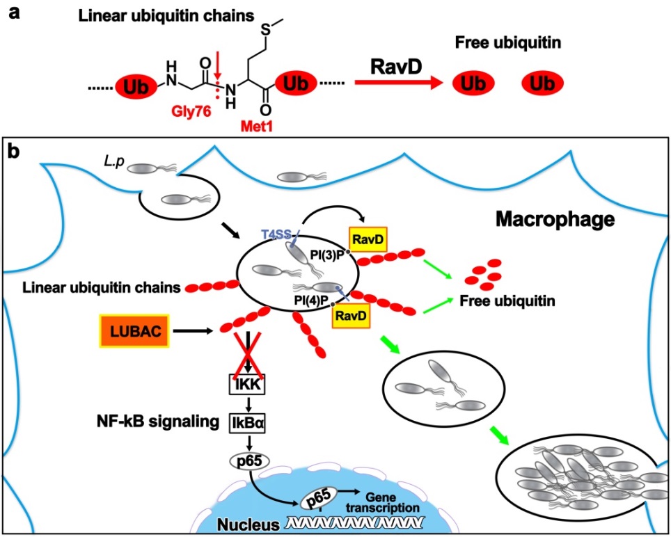 图1. RavD作用机制模式图。a. RavD水解线性泛素链的酶学活性示意图。b. RavD在嗜肺军团菌感染过程中的作用机制模式图。RavD被四型分泌系统分泌后,在宿主巨噬细胞内定位到嗜肺军团菌膜泡结构上,清楚膜泡上的线性泛素链,抑制宿主NF-κB免疫通路。