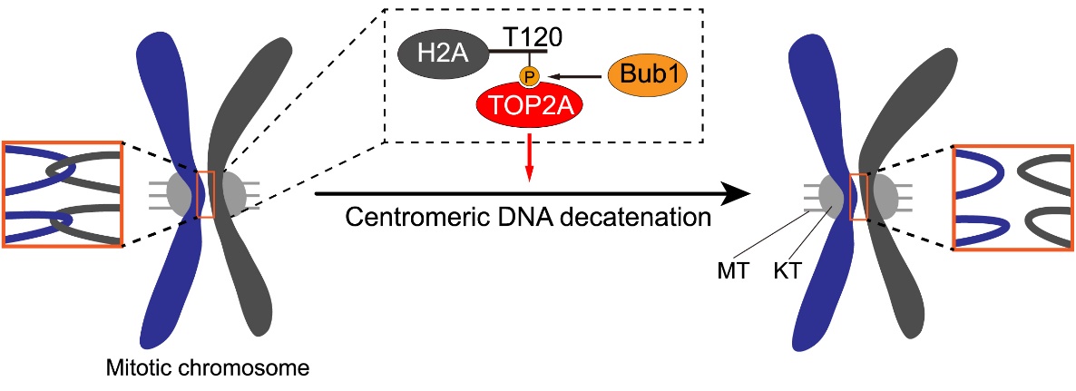 这一系列研究结果表明,当细胞进入有丝分裂时,Bub1对组蛋白H2A的磷酸化修饰招募TOP2A至着丝粒,促进着丝粒区DNA连环的去除,进而保证了染色体的精确分离和基因组的稳定性(图4)。基于TOP2抑制剂在癌症化疗中的广泛应用(John Nitiss, Nat Rev Cancer, 2009),以及近期报道的Bub1小分子抑制剂对于癌细胞增殖的抑制作用(Siemeister G et al., Clin Cancer Res, 2019),这项研究也为靶向TOP2A和Bub1的癌症治疗提供了新的视角。