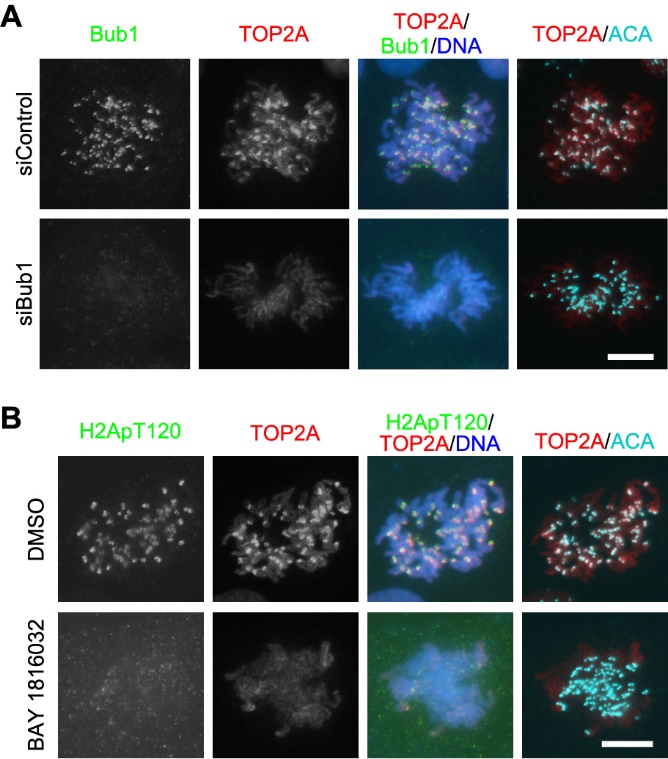 图2:敲减Bub1的表达(A)或利用小分子化合物抑制Bub1的激酶活性(B)去除TOP2A在有丝分裂前中期染色体着丝粒区的富集。