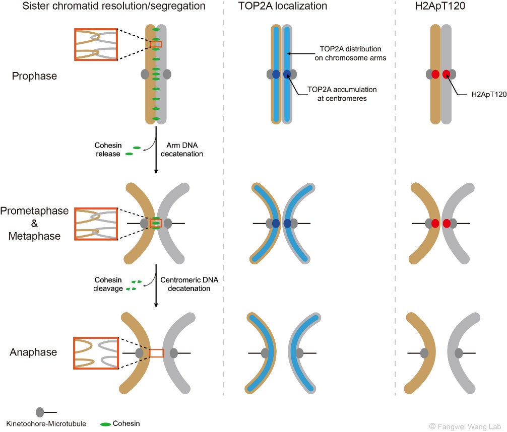 如图1所示,在S期DNA复制完成后,每条染色体形成两条相同的姐妹染色单体,它们靠黏连蛋白复合体(Cohesin)和DNA连环(DNA catenation)顺着染色体长轴紧密结合在一起。有丝分裂期染色体的分离需要去除姐妹染色单体间的粘连(cohesion)和DNA连环(catenation),这一过程分两步完成。首先,在有丝分裂的前期和前中期,伴随着Wapl从染色体臂上移除Cohesin的过程,DNA拓扑异构酶IIα(TOP2A)得以去除双链DNA之间的连环和缠绕,从而解除姐妹染色体臂部的物理联结(Hongtao Yu, Curr Biol, 2013)。在此期间,着丝粒区的Cohesin在Sgo1、Sororin和Haspin等蛋白的保护下逃脱Wapl对其的移除 (Morales C & Losada A, Curr Opin Cell Biol, 2018),并拮抗TOP2A对DNA连环的去除作用(Wang L et al., J Cell Sci, 2010; Farcas A et al., Mol Cell, 2011)。随后,在有丝分裂中期向后期转换的过程中,随着蛋白水解酶Separase对Cohesin的剪切,TOP2A须快速高效地去除着丝粒区染色体间的DNA连环,以使得姐妹染色单体及时分离并在纺锤体的牵引下向细胞的两极移动。