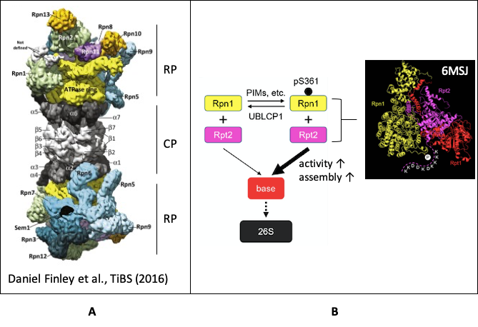 泛素-蛋白酶体系统(ubiquitin-proteasome system (UPS))负责选择性的降解真核细胞中大部分蛋白质。蛋白酶体参与细胞周期,线粒体代谢等各种各样的生命活动,在调控细胞内蛋白质组动态平衡上发挥着重要作用。蛋白酶体功能异常和多种疾病,比如多发性骨髓瘤,阿尔兹海默症等密切相关。蛋白酶体的各个亚基在分子伴侣的参与下逐步组装,最终形成如下类似于筒状的结构(图A),功能上分成 RPCP两部分。RP主要负责识别和去折叠底物,打开20S,介导底物进入20SCP主要负责降解蛋白质。蛋白酶体自身还会受到各种各样的翻译后修饰,比如泛素化,磷酸化,肉豆蔻酰化等。质谱数据表明,蛋白酶体表面有四百多个磷酸化位点,但超过90%的位点尚未被研究。Rpn1作为RP上的一个亚基,是泛素和类泛素结构蛋白的受体,其上有一个进化上保守的位点Ser361,该位点的磷酸化被质谱检测到的频率排前十,但其功能一直没有被研究。那么,Rpn1-Ser361的磷酸化究竟具有怎样的生物学功能呢?