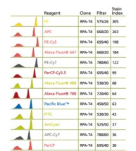 2) 选择光谱重叠小的染料。最常用的4色荧光搭配是FITC,PE,Percp-cy5.5,APC[2]。
