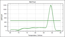 SYBR Green法进行检测时,可根据熔解曲线确认PCR产物的特异性。正常情况下,荧光定量PCR的产物是特异的,这时的熔解曲线为单峰。(如图)