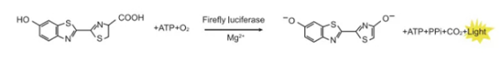 · 将标记好的细胞接种到实验动物体内后,当外源(腹腔或静脉注射)给予其底物荧光素(luciferin),即可在几分钟内产生发光现象。这种酶在ATP,氧存在的条件下,催化荧光素的氧化反应才可以发光,因此只有在活细胞内才会产生发光现象,并且发光光强度与标记细胞的数目线性相关。