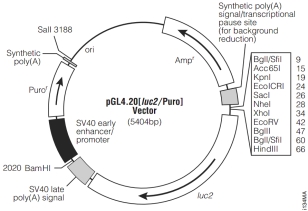 (1)pGL4.20载体,pGL4.20载体含Luciferase荧光素酶报告基因,无启动子,用于研究目的启动子的功能,在荧光素酶基因的上游包含一个多克隆位点,用于插入启动子序列,若Luciferase荧光素酶活性上升,说明该段启动子受到转录因子的调控。