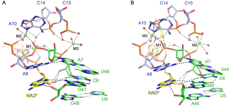 为了阐明NAD+核开关识别配体的机制以及两个串联Domain对核开关发挥功能的意义,任艾明课题组利用X-射线晶体学的方法,分别解析了 Domain1 (Figure 1A) 和Domain2 (Figure 1B) 结合NAD+的复合物结构。研究结果发现,Domain1和Domain2在三维空间上采用类似的折叠方式,都能够形成NAD+识别口袋,并且在识别口袋中,NAD+分子中的ADP(腺嘌呤二核苷酸)结构部分被RNA分子通过氢键作用、堆积作用以及金属离子的介导特异性识别,而NMN(烟酰胺)结构部分飘在结合口袋之外,与RNA分子主体部分没有直接相互作用 (Figure 2)。