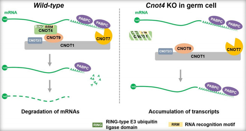 以前在基因敲除小鼠中的研究表明,CCR4-NOT复合体中的两个催化亚基,CNOT7和CNOT6L,分别在雄性和雌性生殖细胞发育过程中发挥关键作用,但与它们协同作用的其他亚基的生理作用还未见报道。课题组首先通过构建Cnot6/6l双敲除小鼠,证明CNOT6/6L亚基对个体存活和雄性生殖没有影响,而是专一性地调控卵子发生。而Cnot4基因敲除造成小鼠胚胎期死亡,说明该亚基具有更广谱的生理功能。进一步在雄性生殖细胞中特异性敲除Cnot4的条件性基因敲除小鼠,则造成精子发生的严重缺陷和雄性不育。这些研究首次在生理条件下提供了遗传证据,表明CCR4-NOT复合体在雄性生殖细胞中,CNOT7可以独立于CNOT6/6L发挥功能,并且受到调节因子CNOT4的影响,共同促进精子生成过程中偶线期到粗线期mRNA的去腺苷酸化和降解。打破了之前体外生化实验结果表明的CCR4-NOT复合体中的CNOT6/6L和CNOT7/8催化亚基要协同催化Poly(A)尾的去腺苷酸化降解的认知。