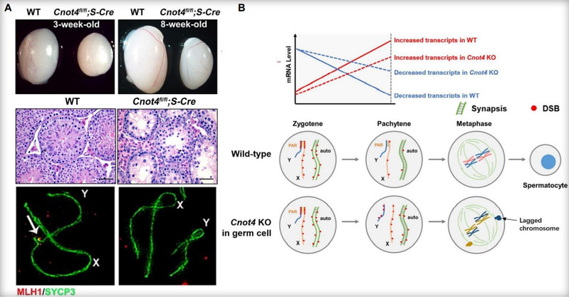 课题组探究了CCR4-NOTCNOT4复合体在雄性生殖细胞减数分裂过程中的功能,在生理层面证实CNOT4是一个RNA结合蛋白,充当CCR4-NOT复合体的一个底物识别亚基。在减数分裂过程中,CNOT4通过其RNA调节基序(RNA regulation motif,RRM),调节减数分裂前期,特别是偶线期向粗线期过渡过程中,mRNA的正常降解。这一生化过程具有以下重要生理功能: 1)促进精子发生过程中所需基因的适当表达; 2)保证减数分裂期间程序性的DNA双链断裂修复;3)促进X和Y染色体之间交叉点的形成和有效配对。雄性生殖细胞中的Cnot4缺失会导致本应降解的转录本的积累,DSB修复缺陷,染色体散落和XY染色体配对失败,最终导致减数分裂中期停滞和雄性生殖细胞凋亡。