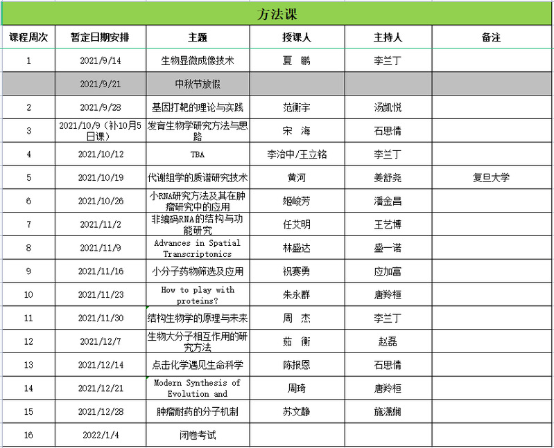 2021-2022年“生命科学研究方法学”课程安排