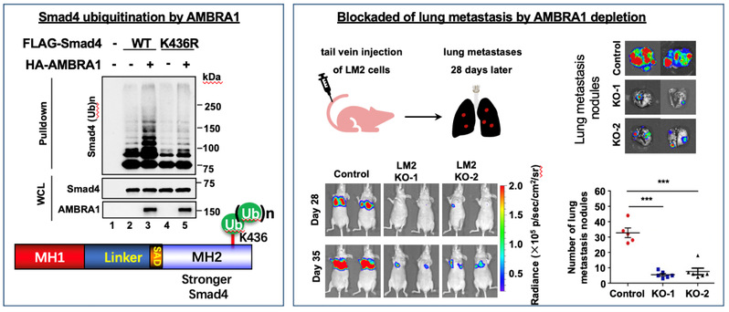 蛋白质翻译后泛素化修饰在信号通路中具有重要功能,也是肿瘤生物学研究的重点和热点。该领域(包括冯新华实验室)过去的工作发现,泛素化修饰可以调控TGF-β家族受体和Smad蛋白的降解,主要通过HECT家族E3连接酶Smurf1/2的作用。为了进一步探索泛素化修饰对TGF-β/Smad信号通路的调控,冯新华实验室与金建平实验室开展深度合作,对DCAF(DDB1- and CUL4-associated factor)蛋白家族进行了筛选。金建平博士早期在美国工作时的主要发现之一,就是发现了含有“WDXR”结构域的DCAF蛋白质家族。DCAFs通常与CRL4-DDB1-Rbx1共同组成E3泛素连接酶复合物,从而对靶蛋白进行泛素化修饰,调控一系列生命活动进程。两家实验室的合作发现了DCAF3 (又称AMBRA1)能够显著增强TGF-β/Smad信号响应。进一步机制研究表明,AMBRA1可以对TGF-β/Smad信号通路中关键因子Smad4进行K63连接的多聚泛素化修饰,从而强化Smad4和共转录因子CBP/p300的结合,提高Smad4的转录活性,进而增强TGF-b对乳腺癌肿瘤转移的促进作用。