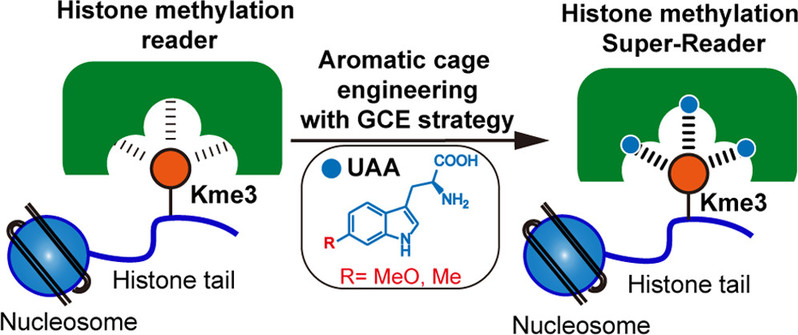 2022年4月5日,我院林世贤实验室在美国化学会志(Journal of the American Chemical Society)上在线发表题为“Manipulating cation-π interactions with genetically encoded tryptophan derivatives” 的研究论文。该论文首次提出了提升阳离子-π相互作用的工程改造新策略,并构建了甲基化修饰的超级读码器用于H3K4me3的检测和成像。这一研究是其实验室开发的嵌合体翻译系统的一项重要研究进展,有望通过构建系列超级读码器,实现组蛋白甲基化修饰的高灵敏在体检测及其精准干预。我院博士后赵红霞和博士生刘超是论文的共同第一作者,林世贤研究员是本文的通讯作者。