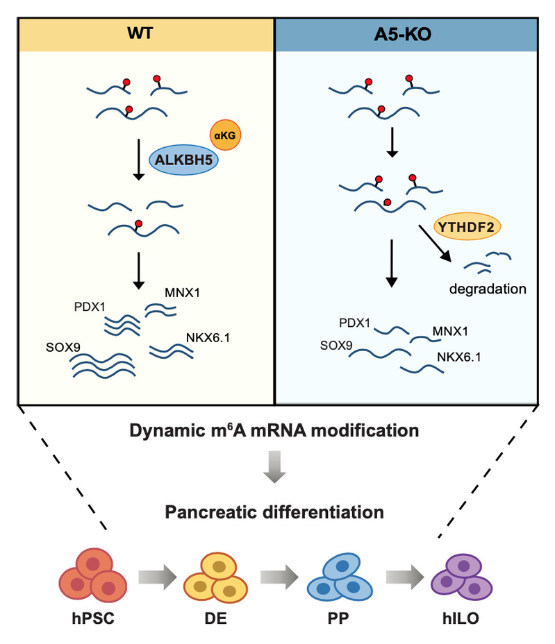 2022年7月18日,浙江大学祝赛勇/刘建钊实验室合作在Nature Communications发表题为“N6-methyladenosine modification-mediated mRNA metabolism is essential for human pancreatic lineage specification and islet organogenesis”的研究论文,首次绘制了整个人胰腺分化过程中的mRNA m6A修饰的动态变化图谱,详细研究了m6A修饰对于胰腺细胞分化过程的基因表达调控,并揭示去甲基化酶ALKBH5在胰腺谱系分化和胰岛类器官发育过程中起着关键作用。