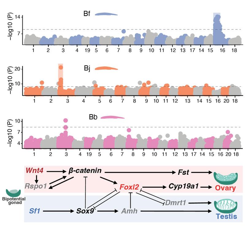 图3 三种文昌鱼Bf(佛罗里达文昌鱼)Bj(日本文昌鱼)Bb(白氏文昌鱼)的性别决定区域,X轴为染色体数字和基因组坐标。下图为脊椎动物现已知的性别决定通路