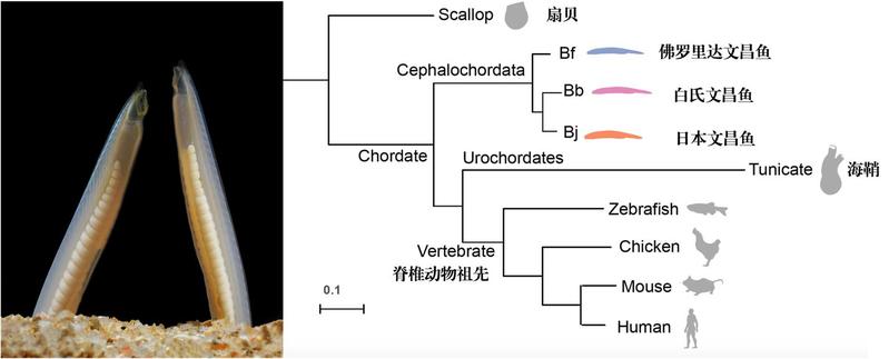 1 左图为雌(右)雄(左)佛罗里达文昌鱼,右图为基于本项目基因组构建的系统发育树。支长代表每一个代表性物种的基因组演化速率,由图可见,其实文昌鱼并不是脊椎动物的最近的外群,但由于其演化速率较慢,外形和基因组特征与脊椎动物更为接近,是最适合研究脊椎动物起源的无脊椎动物外群。