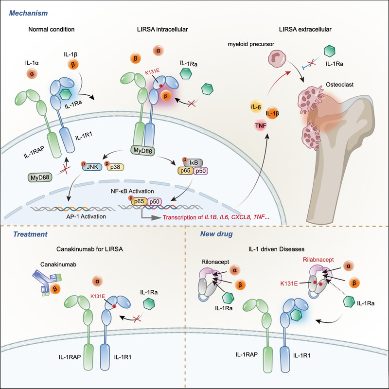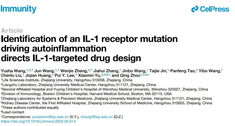 2023年6月13日,我院周青实验室、浙江大学良渚实验室俞晓敏课题组联合温州医科大学附属第二医院儿童风湿科郑雯洁主任在Immunity上发表题为“Identification of an IL-1 receptor mutation driving autoinflammation directs IL-1-targeted drug design”的研究论文,首次报道了人类IL-1R1(p.Lys131Glu)错义突变破坏了IL-1R1与其拮抗剂配体IL-1Ra的结合,导致IL-1信号通路持续不受控地激活,引起炎症的自身炎症反应,在临床上表现为慢性复发性多灶性骨髓炎(Chronic recurrent multifocal osteomyelitis,CRMO)。根据发现的致病原因,作者将该疾病命名为Loss of IL-1R1 Sensitivity to IL-1Ra ,LIRSA。揭示的发病机制指导患者的靶向治疗,取得了极佳的治疗效果。并且,根据发现的这一突变只破坏IL-1R1与IL-1Ra的结合,不影响其与IL-1α/β结合的特性,作者设计出一种新的IL-1抑制剂rilabnacept,它可以捕获IL-1α和IL-1β,但与IL-1Ra的亲和力低,保持其在体内抑制IL-1的功能,从而增强抑制炎症的效果。