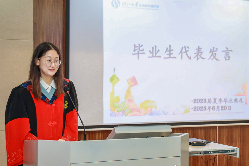 毕业生代表张燕君向老师、同学及生研院提供的平台表达了衷心的感谢,并回顾了自己的博士科研生活,她感言:接受平凡而绝不甘于平庸,五年磨砺,成就更好的自己。同时也向各位毕业生们发起“共同整装待发,奔赴下一场山海”的号召。