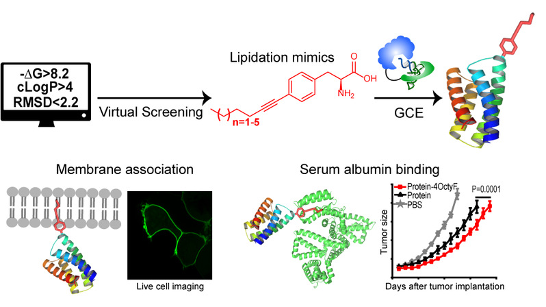 林世贤课题组首先开发了一种计算辅助的评价策略,虚拟评估了数百种脂化修饰非天然氨基酸的疏水性,白蛋白结合力,及其被正交翻译系统识别的可能性。计算机辅助的评估发现了一类含有芳香环和线性脂肪族侧链的非天然氨基酸能够完全模拟天然脂化修饰的膜定位和白蛋白结合的生化特性。同时,利用其课题组开发和优化的嵌合体翻译系统,实现了多个长度可调的脂化修饰的遗传编码,并在多种功能蛋白质上高效、特异地引入脂化修饰。进一步的生化实验表明,多种遗传编码的脂化修饰蛋白质与天然脂化修饰蛋白质具有相同的细胞膜结合能力和生物学功能。通过遗传编码不同长度的脂化修饰,研究发现脂化修饰的疏水性强弱是决定其能否具有稳定质膜结合的重要参数,且具有13个碳和15个碳长度的脂肪链具有截然不同的细胞质膜锚定特性。这一发现很好地解释了哺乳动物细胞中大多数蛋白质的脂化修饰碳链长度最少是14个。最后,通过将脂化修饰精准地展示在药物蛋白质上,能够将药物蛋白结合血清白蛋白的亲和力提升至nM水平,从而显著延长药物蛋白的血清半衰期,在小鼠肿瘤模型中展示出了更好的抗肿瘤能力。