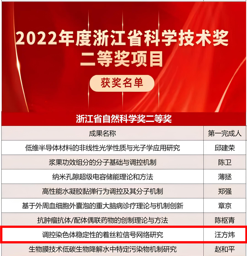 日前,浙江省创新深化大会在省人民大会堂举行,会上公布了2022年度浙江省科学技术奖获奖名单(自然科学奖59项、技术发明奖22项、科学技术进步奖217项、国际科学技术合作奖6项)。我院汪方炜教授主持的成果“调控染色体稳定性的着丝粒信号网络研究”荣获浙江省自然科学奖二等奖。