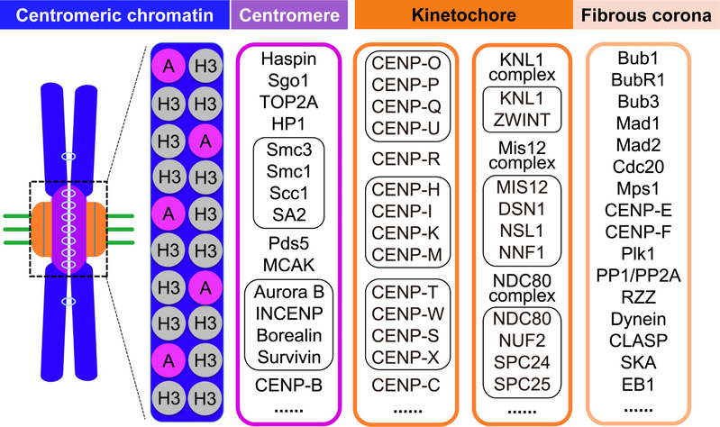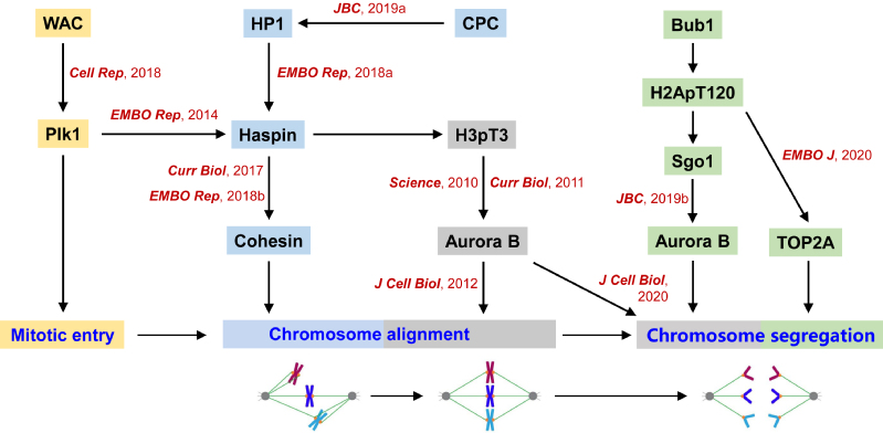 (1)解析了蛋白激酶Aurora B、Bub1、Cdk1、Haspin和Plk1协同调控着丝粒组装、着丝粒与动粒互作、动粒与纺锤体微管附着的分子机制;
