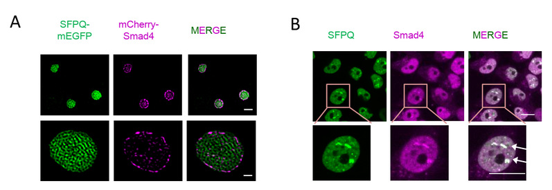 1SFPQ凝聚体分子A)和细胞(B)水平滞留抑癌蛋白Smad4