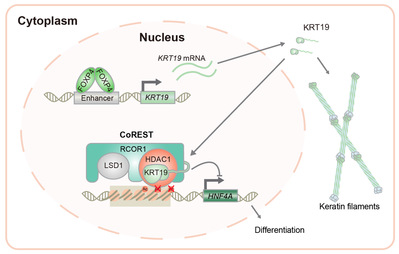 我院赵斌实验室在《Hepatology》在线发表了题为“Nuclear KRT19 is a transcriptional co-repressor promoting histone deacetylation and liver tumorigenesis”的研究论文。该研究阐明了肝癌细胞中高表达的细胞骨架蛋白Keratin 19 (KRT19)可以进入细胞核内,通过促进CoREST复合物组装,激活HDAC1的去乙酰化酶活性,进而抑制肝细胞特异性基因表达,促进肝细胞癌去分化的新机制。