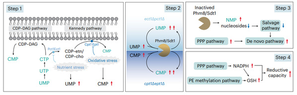本项研究中,作者以真核模式生物酿酒酵母为研究模型,发现CTP在参与磷脂合成过程时,自身实现了循环回收,为细胞提供了一种监测嘧啶回收能力的手段;细胞通过选择不同CTP策略的磷脂合成通路可以协调核苷酸合成与回收代谢的平衡,改变磷酸戊糖的生成需求,进而影响了还原性代谢物的合成,从而改变细胞的氧化还原平衡状态。具体而言,作者发现Kennedy通路的缺陷将导致激活态胆碱和乙醇胺(CDP-choline/CDP-ethanolamine)在胞内发生数以百倍的积累,并会限制了嘧啶核苷酸的再利用。在核苷酸酶的底物抑制效应下,Kennedy通路缺陷促使细胞激活补偿机制,进行从头核苷酸合成。这种依赖于磷酸戊糖途径的从头核苷酸合成促进了还原型辅酶NADPH的产生,进一步提升谷胱甘肽合成;同时,Kennedy通路的缺陷会让细胞更依赖于PE甲基化的过程来合成PC,而这一反应所具备的甲基吸收池(methyl sink)功能也将协调促进谷胱甘肽的合成[3, 4]。