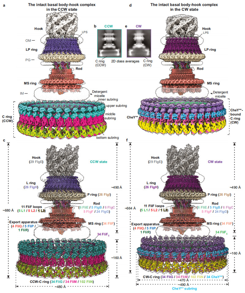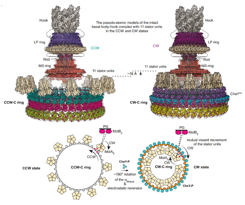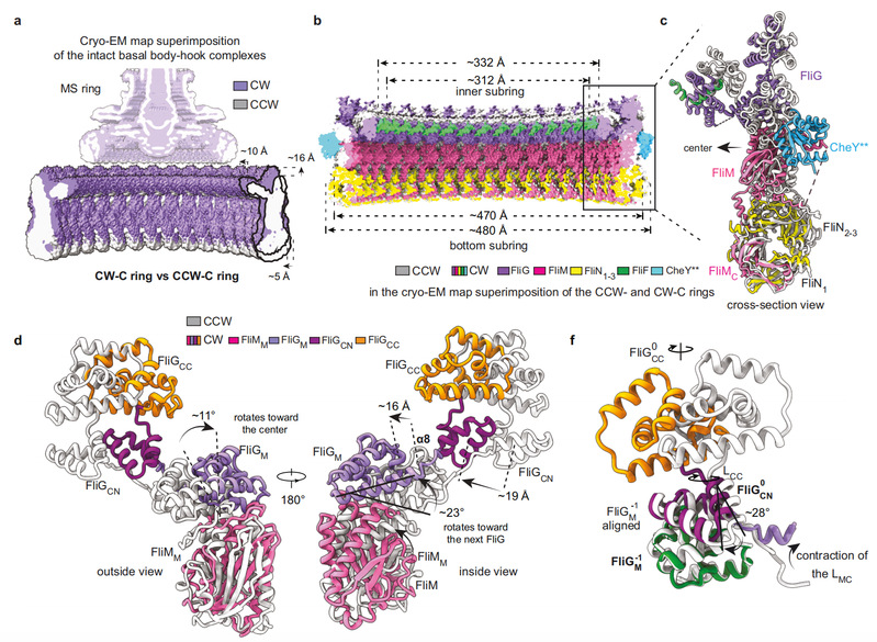 图1. 方向开关复合物的细菌鞭毛马达在逆时针顺时针旋转状态下的冷冻电镜电子密度和三维结构。